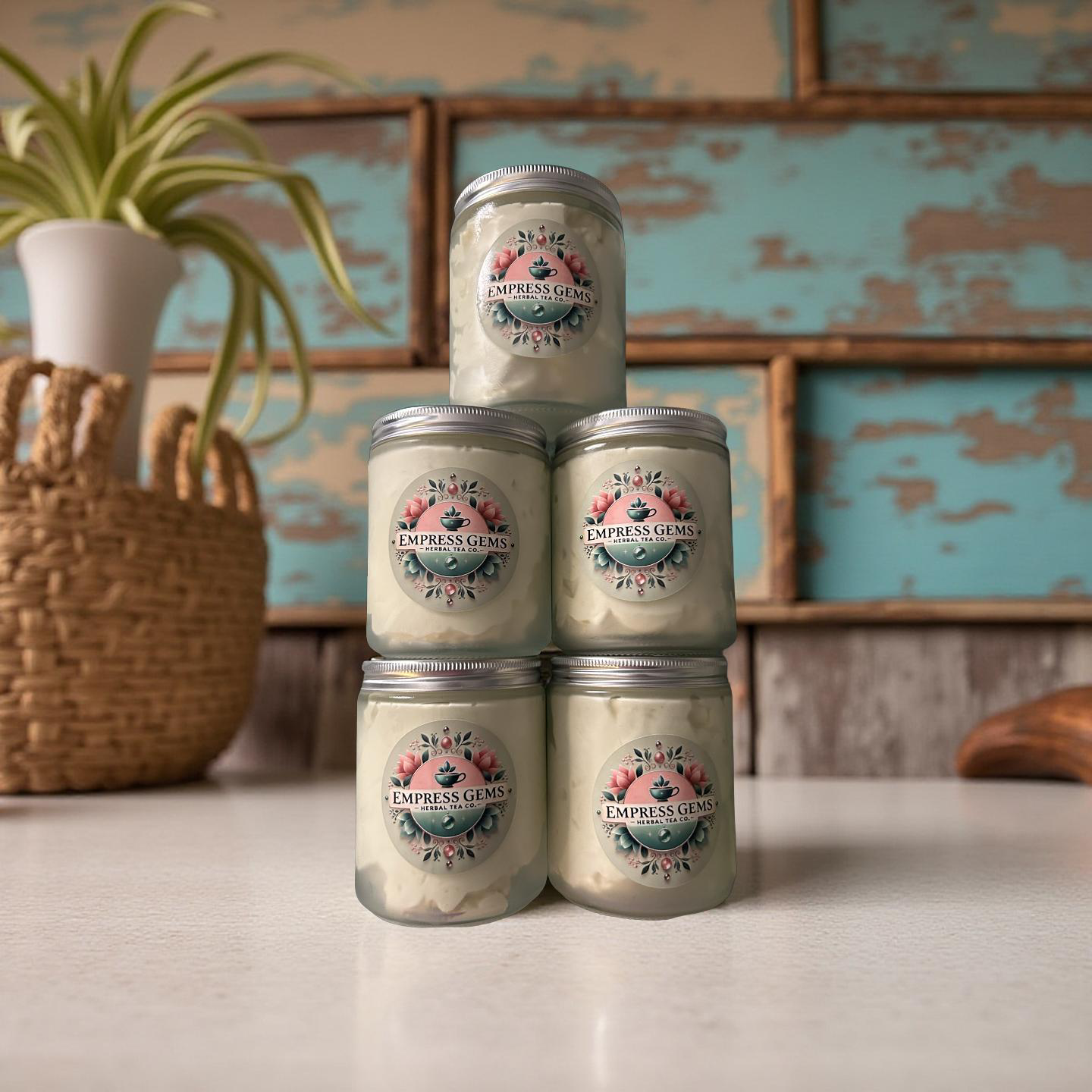 Royal Glow is a rich, ultra-hydrating body butter infused with skin-loving butters and oils to deliver deep moisture, a luminous glow, and silky softness. Crafted with shea butter, mango butter, and jojoba oil, this luxurious blend melts into your skin, leaving it feeling deeply nourished, smooth, and radiant.